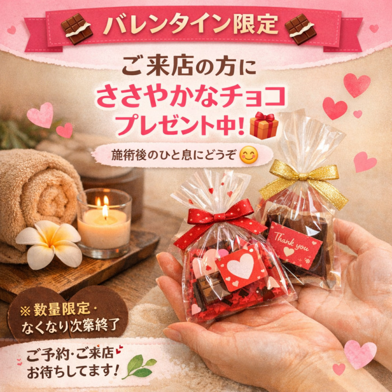 ご来店のお客様にささやかなチョコレートをプレゼントします☺️施術でほっと一息ついたあとに、